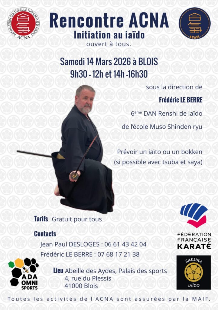 Le prochain stage d’initiation au iaïdo, ouvert à tous, se déroulera le samedi 14 mars 2026 à Loches, le matin de 9h30 à 12h00 et l’après midi de 14h00 à 16h30.